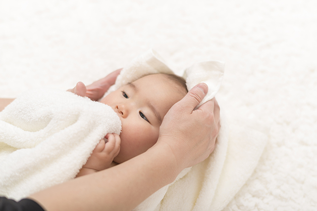 毎日のスキンケアの方法も重要です。沐浴や入浴では、石けんをよく泡立てて、泡をお肌に置き、ゴシゴシとこすらず、そっとなでるようにして洗います。お湯の温度は38~40℃と大人が少しぬるく感じる程度がおすすめ。お風呂上りは、1時間以内を目安にできるだけ早めに保湿剤を塗ってください。