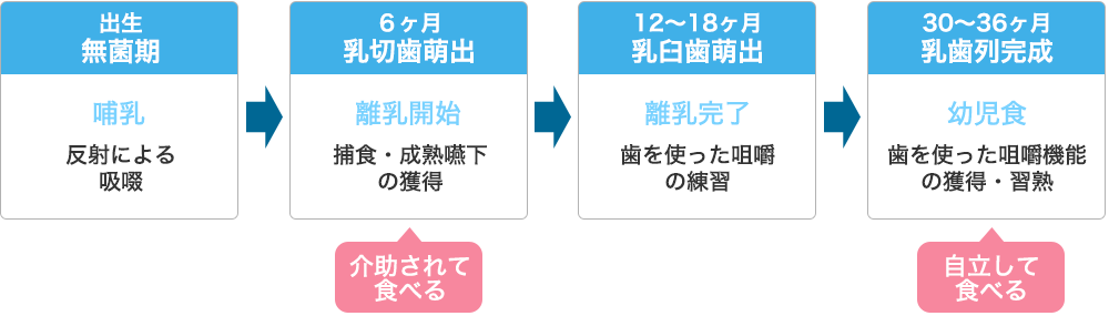 個人差はありますが、生後6ヶ月くらいから下の前歯が生え、生後8ヶ月頃に上下の前歯が生え揃う時期には、舌で食べ物を押しつぶしたり食べ物を運んだりできるように。やがて歯ぐきがふくらんでくると、歯ぐきを使って食べ物をかみつぶすことができ、徐々に咀嚼が可能になります。