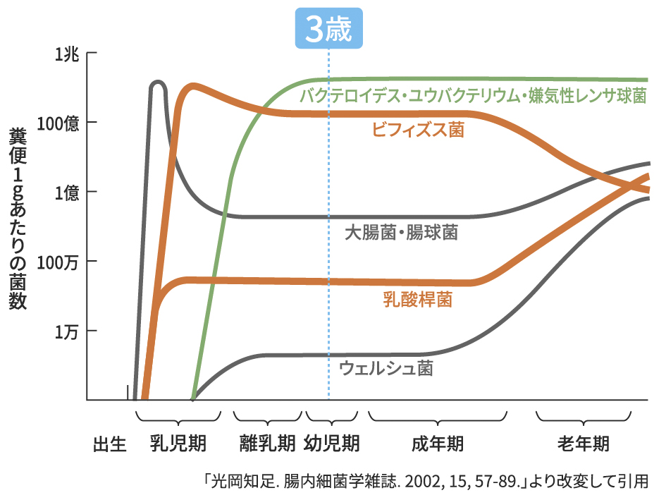 腸内細菌の種類は人によってさまざま。3歳頃までにその人特有の腸内フローラが育成され、その後の菌の数は年齢によって増減しますが、健康な生活を送っている限りは、菌の種類とバランスはほとんど変わらないといわれています。しかし、食生活、生活習慣、服用した薬(特に抗生物質)によって変化することもわかっています。