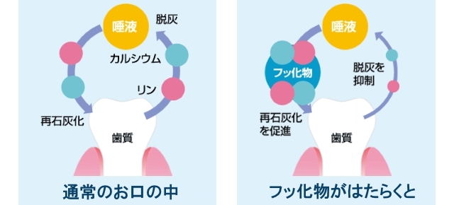 また、フッ素にはむし歯菌が作りだす酸の量を抑えるはたらきもあり、酸が歯を溶かすのを防ぐことで、むし歯を予防します。