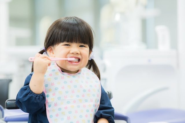 乳歯が生え揃ってくる1歳頃から半年に1度くらいの割合で歯科医院の定期検診を受け、先生に相談しながらフッ素塗布も受けるのがよいでしょう。