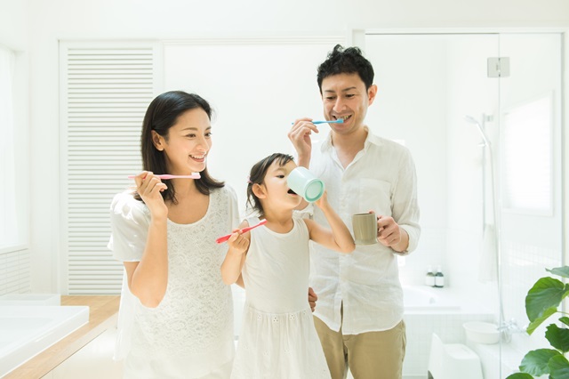 海外には、むし歯予防のために水道水にフッ化物を添加している国もあります。ですが、日本では取り入れられていません。そこで、日常のお手入れでは、歯が生え始めた頃にはフッ素入りのジェルを、ブクブクうがいができるようになった頃を目安にフッ素入りのジェルやハミガキの使用をおすすめします。最初は子ども向けの、薄味で低刺激の歯磨剤を選ぶとよいでしょう。フルーツの香味などで歯みがきを楽しく感じ、スムーズに習慣化ができるかもしれません。