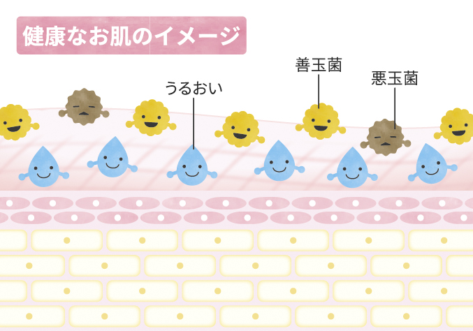 つるつる&すべすべの赤ちゃんのお肌は大人の憧れですが、実はとてもデリケート。皮フが薄くてバリア機能が未熟なため、乾燥しやすく、アレルゲンなども侵入しやすい状態です。また、お肌にはさまざまな常在菌がいますが、ここにも善玉菌と悪玉菌があり、それらのバランスが肌あれやアトピー性皮膚炎にも関係していることが近年の研究で少しずつわかってきています。さらに、乳幼児期のアトピー性皮膚炎は、成長とともに花粉症などさまざまなアレルギーを発症する「アレルギーマーチ」の引き金のひとつになることもわかってきました。