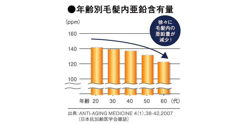 加齢とともに、だんだん柔らかく、ボリュームがなくなっていく髪。サンスターは、そんな“加齢毛”の悩みを研究し、2014年に髪のキューティクル層における「亜鉛」(※2)減少が、髪のハリコシやボリュームなどの低下に影響を与えることを明らかにしました。