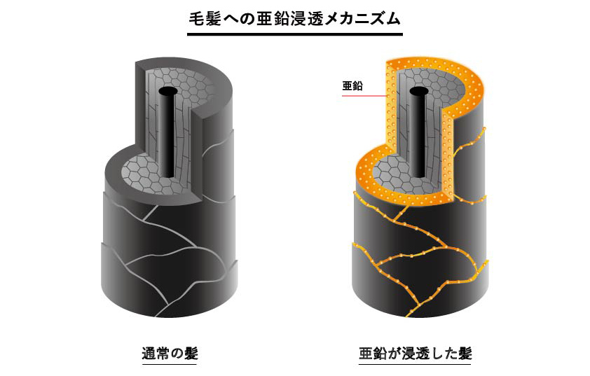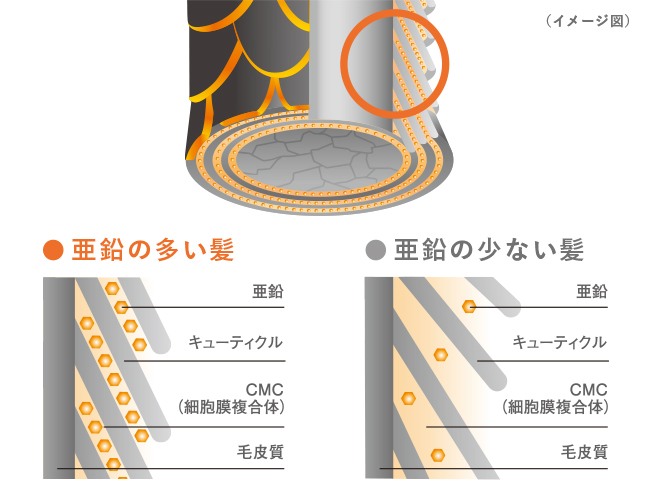 ①毛髪補強成分「亜鉛」が、サンスター独自の浸透処方でキューティクル層のすき間に浸透。髪を内側から強くし、ハリコシを与えます。