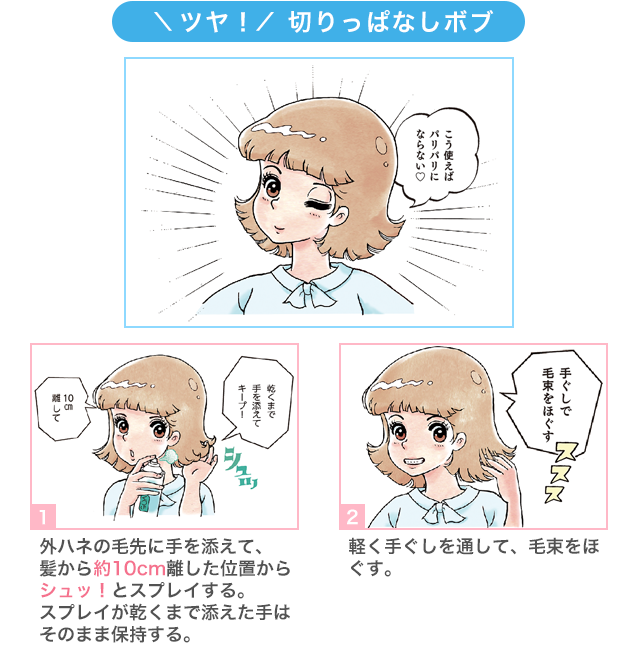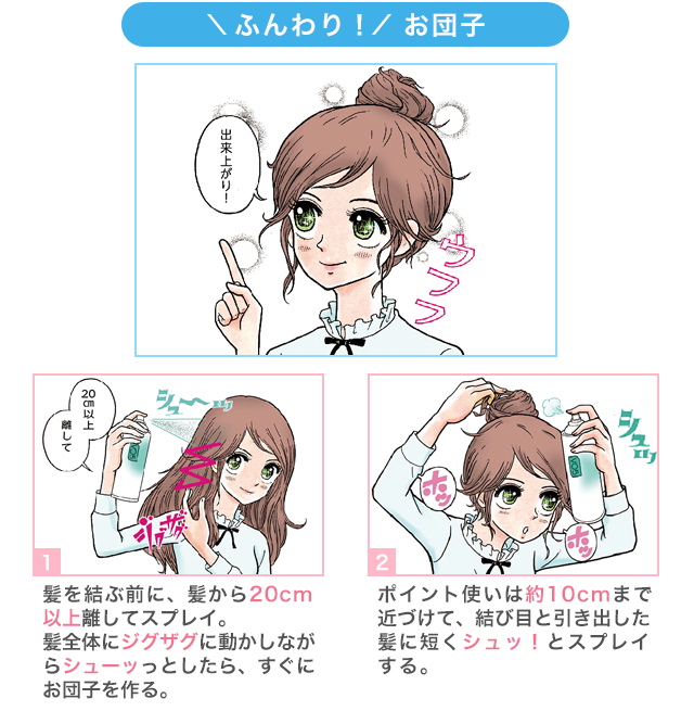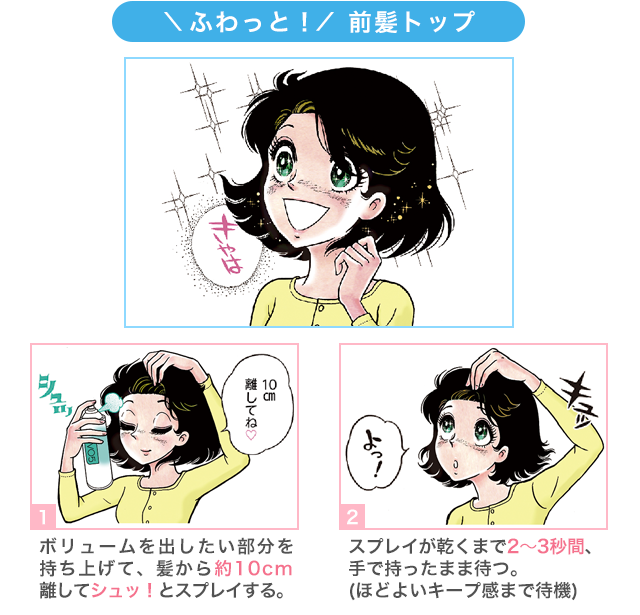 ■ふんわりと自然に仕上げたいときは、髪から20cm以上離してシューッ!