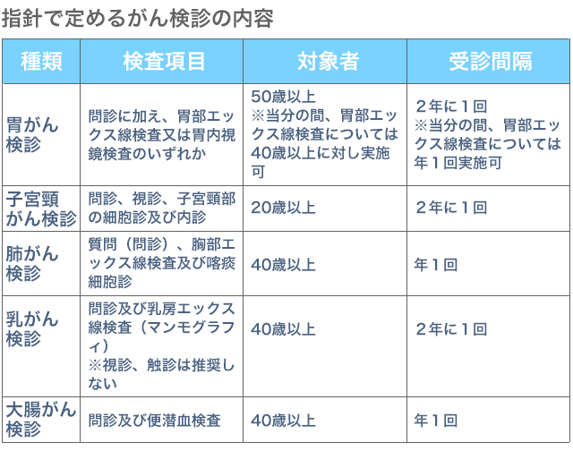 胃がん・大腸がん・肺がん・乳がん・子宮頸がんの5大がんの早期発見を目的に、自治体が一定の年齢範囲の住民に対して検査方法を指定して実施する。