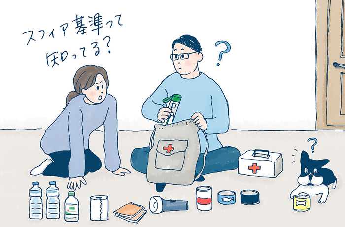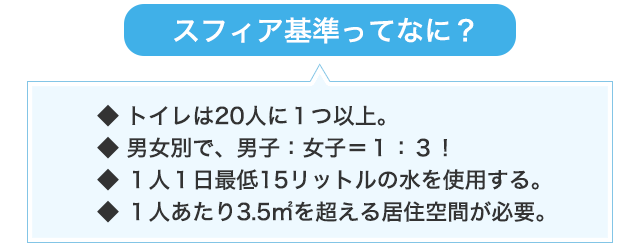 具体的にさまざまな基準がありますが、特に報道などで話題になるのは、被災者の健康に直結する「技術的基準」といわれる箇所。「給水・衛生・衛生促進」「食料の確保と栄養」「シェルター・居住地・ノンフードアイテム(生活道具など食品以外の物品)」「保健活動」の項目があり、そこからさらに細かく、理想的なトイレの数や水の量などの指標があげられています。