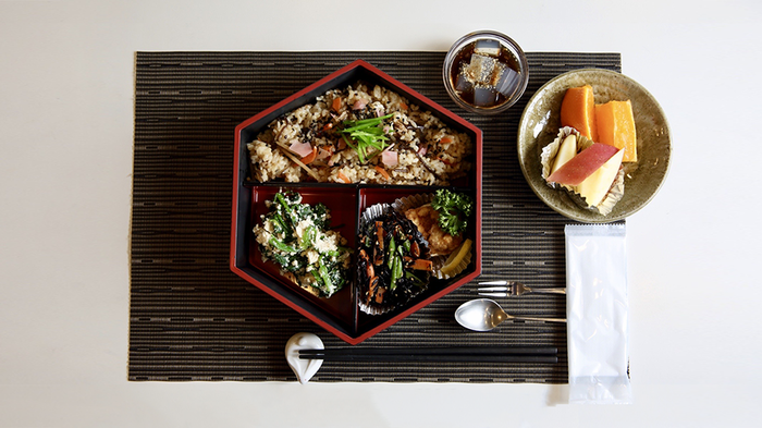 アイディアいっぱいの玄米菜食ランチ。例えば玄米いなりちらしは、酢飯にすることでクセをなくし、玄米が苦手という方でも食べられるように工夫されています。「道場からあげ」は木綿豆腐を使った唐揚げ。さらにこの地の名物である水寒天もあり、食の好奇心をくすぐられます。