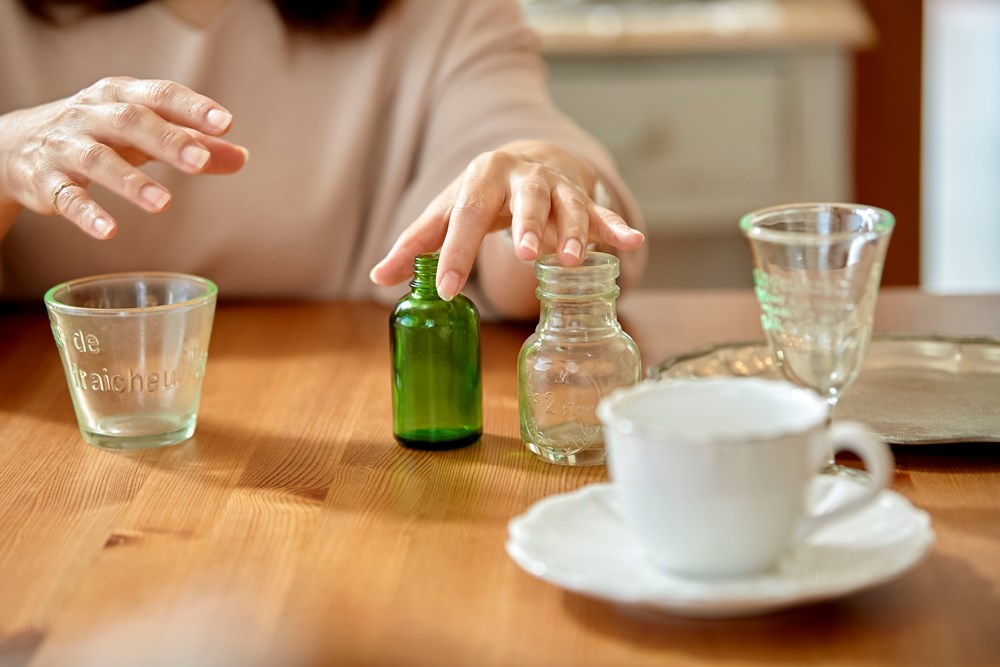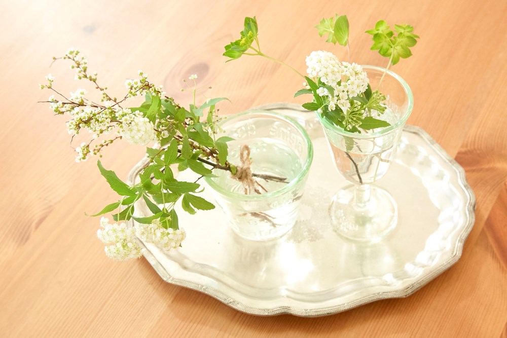 「『かわいい花瓶がないから飾れない』とおっしゃる方もいますが、難しく考えなくていいんです。お家で使っていないコップやティーカップ、小瓶などでいい。ブーケの場合なら、バランスよくゴムで留めてあるので、外さずにそのまま入れてください。お水も替えやすいですしね。ブーケのように留めていない場合や長さを整えた場合には、麻ひもなどで縛ると見た目もよくなります」