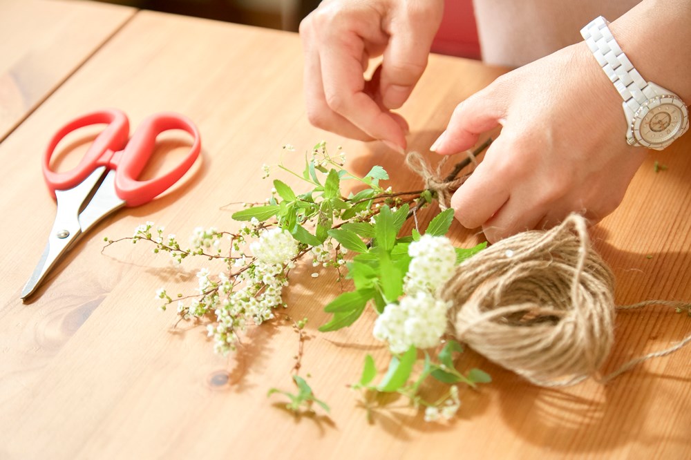 数本を飾る時、麻ひもで縛ればお花がバラバラになりません。