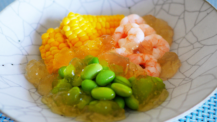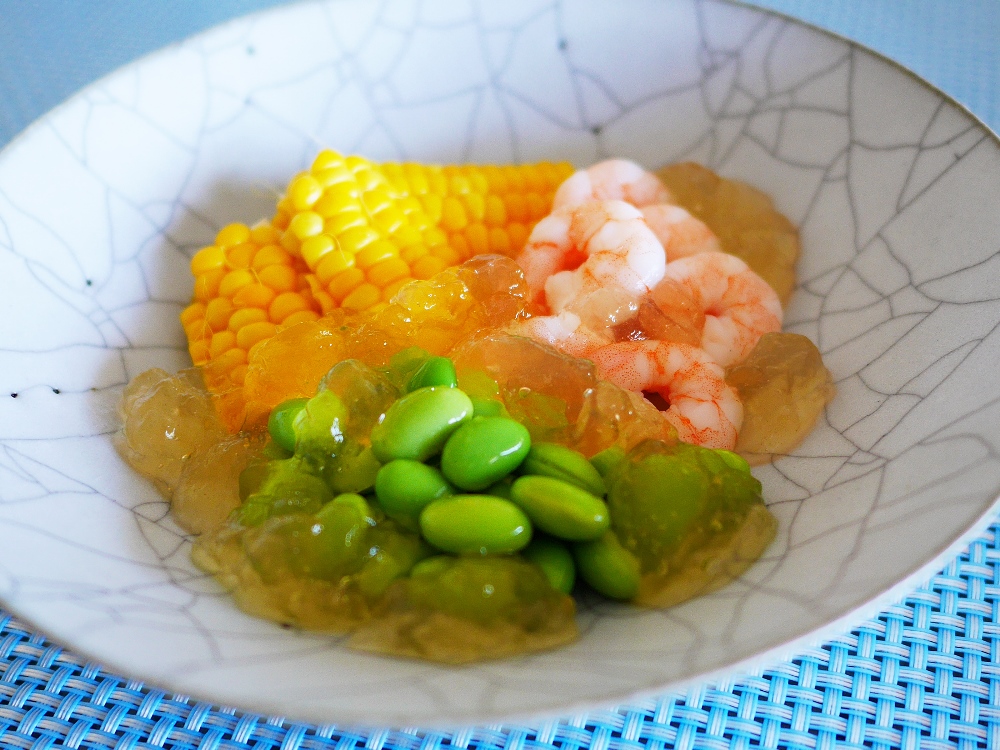 ③器にトウモロコシ、枝豆、ゆでエビを乗せて、コンソメゼリーをスプーンで崩しながらプルプルと乗せる。