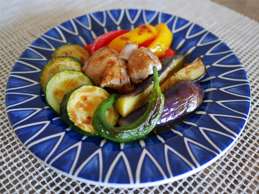 ③フライパンにオリーブオイルをひき、野菜を焼いていく。ナスやズッキーニは油をたっぷり使って焼き上げるとジューシーでおいしく仕上がる。焼き上がった野菜は熱いうちにつけダレにつけていく。最後に鶏肉を焼き、同じ様につけダレにつける。まとめて大きなタッパーにつけダレごと入れて、冷めたら冷蔵庫へ。すぐに食べてもおいしい。