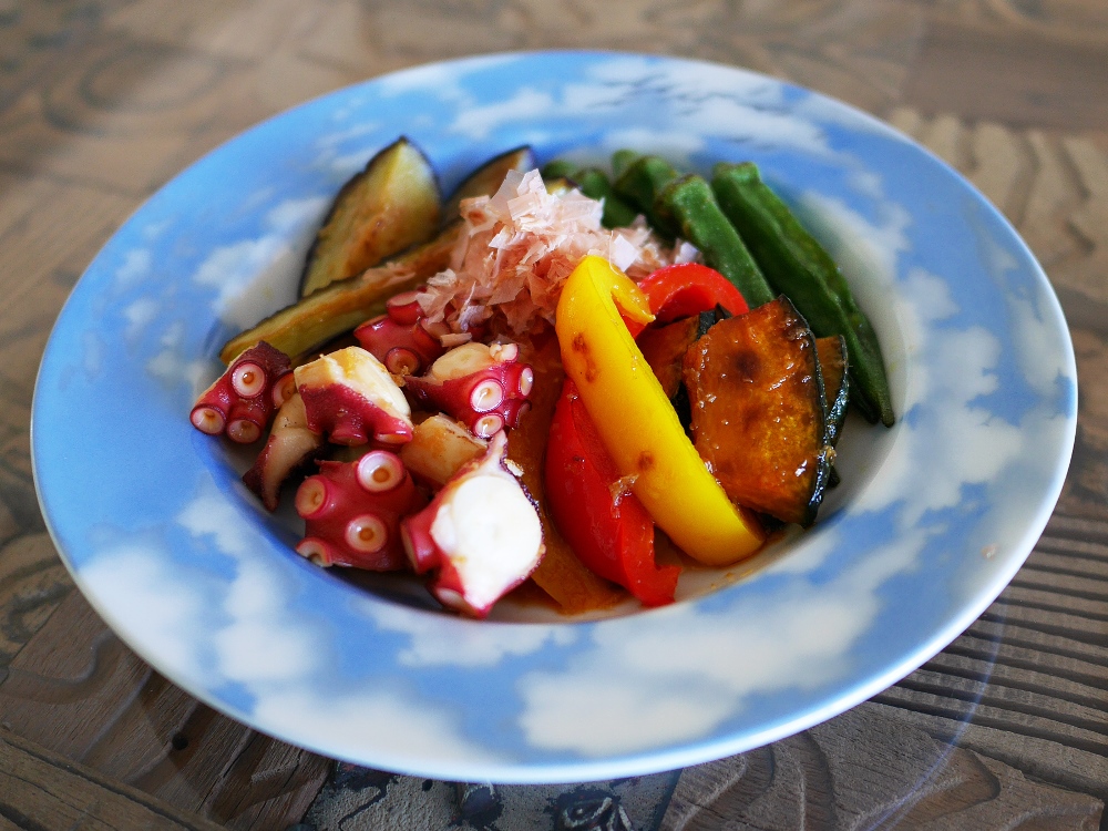 ズッキーニやししとうの代わりに、かぼちゃやオクラを使いました。