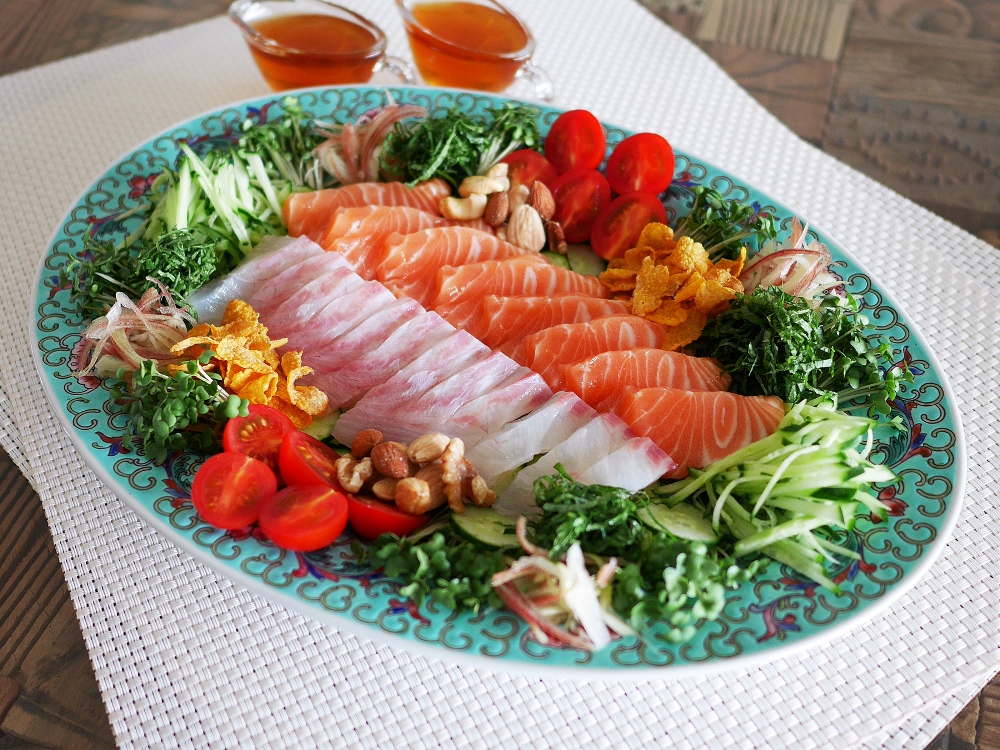 火を使わずに作れて、食欲増進につながる香味野菜が入った、パーティーにもふさわしい豪華メニュー。刺し身を野菜やナッツと一緒に食べることで栄養バランスも整います。ナンプラーで作る自家製ドレッシングも美味です。