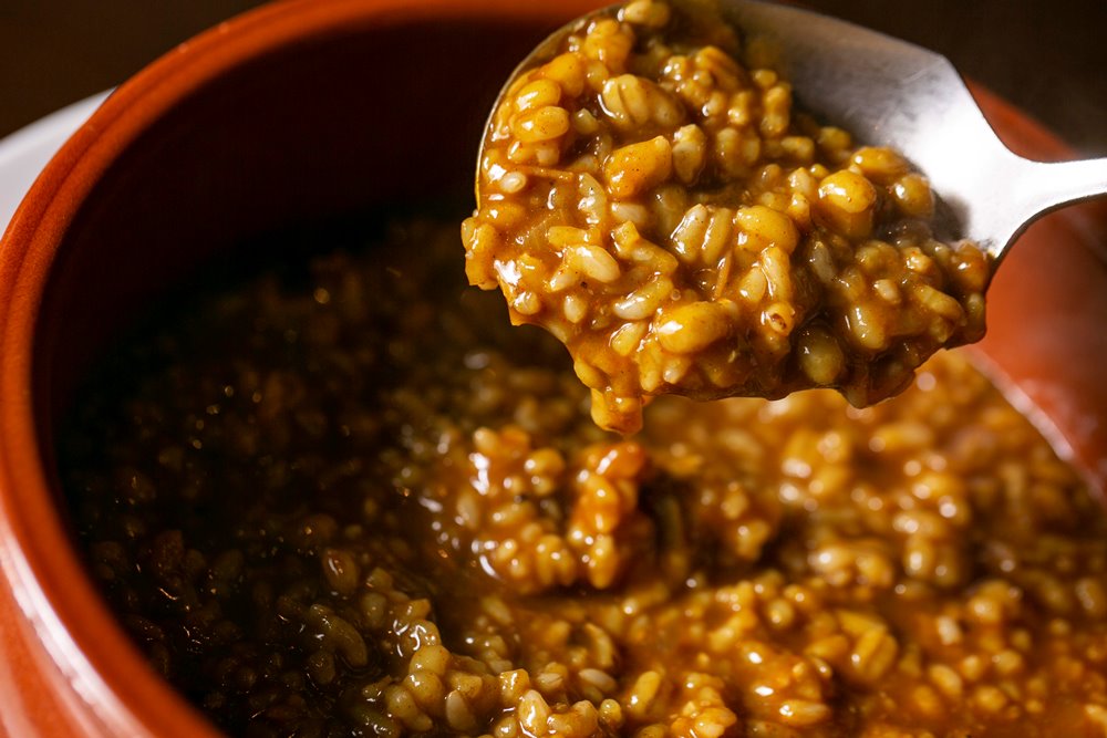 魚介のうまみを存分に「健康道場 玄米ごはん」に染みわたらせた、熱々の米料理。雑炊でもなくおじやでもない、出汁とからんだ米のとろみも楽しんでください。
