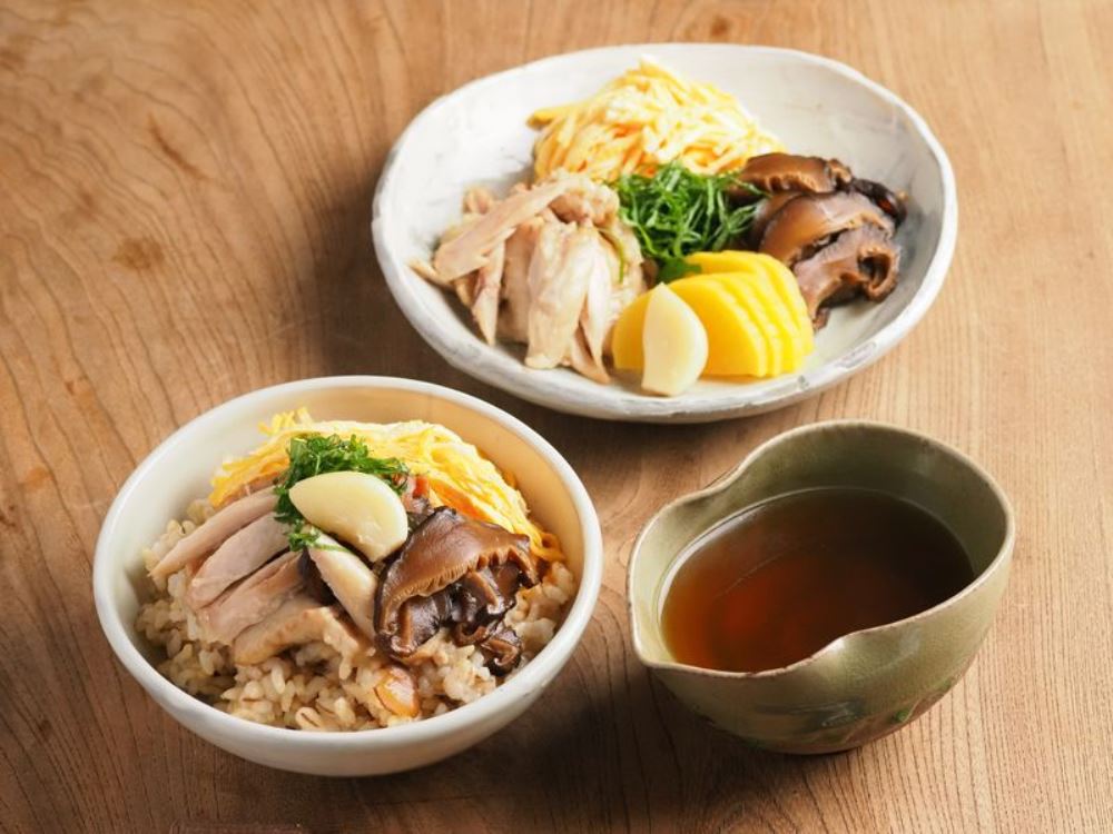 ⑦玄米ごはんを温めて茶碗に盛り、4の鶏肉、5の干ししいたけ煮、6の錦糸卵、そしてにんにく、刻んだ大葉をのせます。手羽先を煮たスープを温めてかけたら出来上がりです。