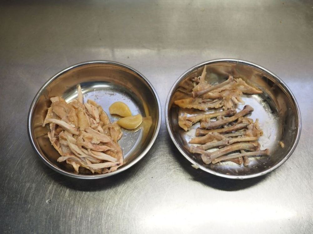 ④取り出した手羽先は、触れるようになったら身をほぐしておきます。