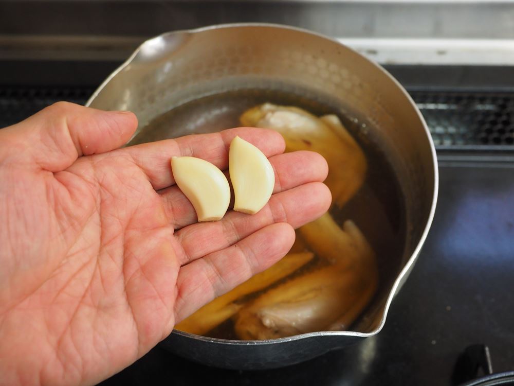 鶏飯にいれるにんにく。一緒に煮込んでおけば手間いらずで、にんにくの風味が鶏、出汁に広がり、そしてカラダにも良いと一石三鳥。今回のレシピでは、箸を入れればほろっと崩れるぐらいになります。