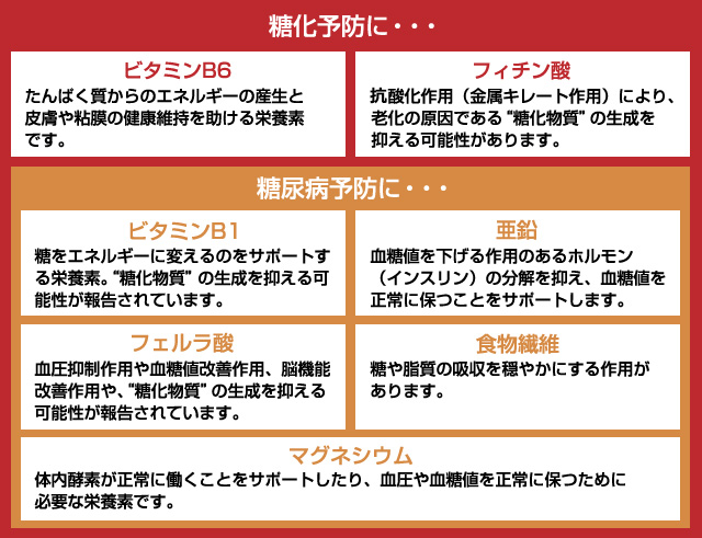 糖化予防になるビタミンB6やフィチン酸、糖尿病予防になるビタミンB1、亜鉛、フェルラ酸、食物繊維、マグネシウムなども豊富に含まれています。