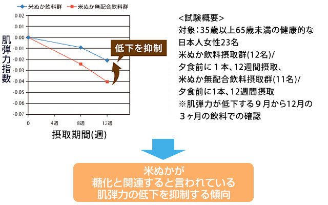肌の弾力が特に低下する秋から冬にかけて、「米ぬか」摂取による肌状態の確認試験を行ったところ、米ぬかに肌弾力低下を抑制する傾向があることが、最近の研究からわかってきました。