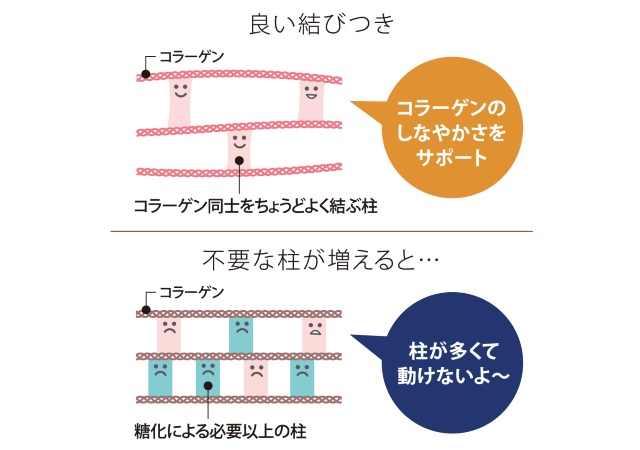 肌のハリをつかさどるコラーゲンは、他の構成要素に比べてターンオーバーが遅いため、「糖化」による糖化物質AGEsの蓄積が起こりやすいといわれます。コラーゲンは、通常、コラーゲン同士を適度に結びつける柱によってそのしなやかさを保っています。しかし、肌にAGEsが蓄積される過程では、コラーゲンの層の間に不要な柱が増えてしまうのです。