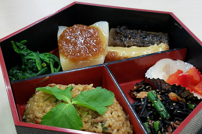 取り組みの中でも特に個性的なのが、福利厚生施設の「心身健康道場」。健康診断で生活習慣病のリスクを指摘された社員はここに体験入門し、2泊3日、独自の健康法を実践。食事・身体・心のバランスを整えるきっかけを作ります。ここで取り入れている入浴法や食事法など、これまでもいろいろお伝えしてきましたが、今回は社員に人気の高い「健康道場弁当」をご紹介したいと思います。