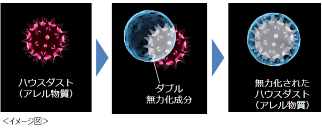 「どんなに頑張ってお掃除しても取りきれない残留ハウスダストがあるのだとしたら、それ自体を無力化してしまおう!」。そんな斬新な発想で研究を進めた結果、サンスターは、植物由来のガロタンニンという成分と、フェノール系高分子を最適な割合で配合し、ハウスダストに対して効果を発揮する処方を開発(図1)。残留ハウスダストを包み込んで、無力化することに成功しました。しかも、一度無力化されたハウスダストは元には戻りません(図2)。