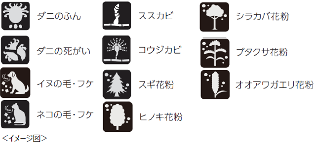 「アレリア シールドミスト」の使い方は簡単。お掃除のあと、カーペットやソファー、寝具、ぬいぐるみなどにスプレーするだけで、取りきれなかった残留ハウスダストを無力化してくれます。対応できるハウスダストは、ダニのフンやダニの死がいはもちろん、ペット系、花粉系など全部で11種類(図3)。