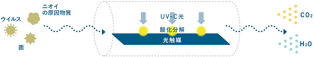 「光触媒」と聞くと難しそうに感じますが、実は紫外線を活用したシンプルでクリーン、かつ安全な仕組み。空気中に浮遊する菌・ウイルス・においの原因物質を、紫外光を使った光触媒反応を活用して、水と二酸化炭素などに分解してしまうのです。しかもフィルターを交換したり、水を補給したりといったメンテナンスの手間いらずなのも、活用の場をひろげる理由のひとつになっています。