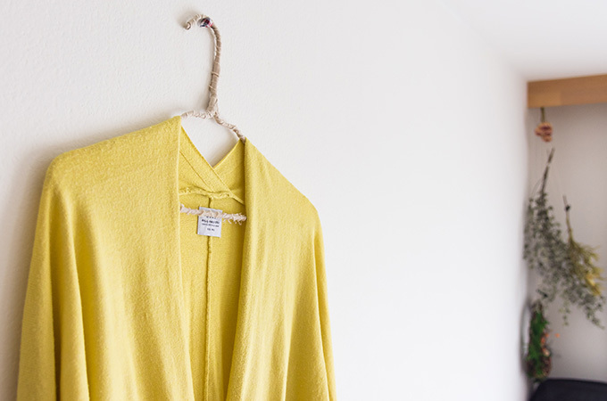 ワードローブの中から、長い間洗濯してなかった、ウールのカーディガンをチョイス。薄汚れてしまったうえに、襟元に口紅で汚したあとが。