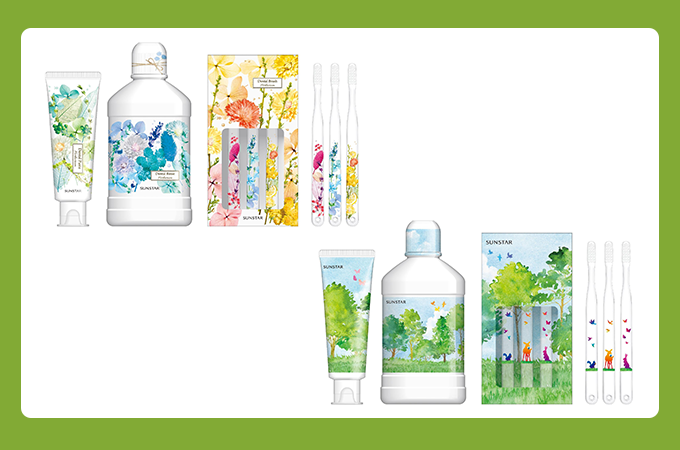 「GUM暮らしを彩るデザインシリーズ」は、2種類の鮮やかなデザインが施された、歯周病予防をサポートするオーラルケアセット。
