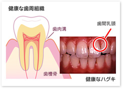 健康なハグキ(歯肉)はピンク色で弾力があり、歯と歯の間の歯肉(歯間乳頭)は引き締まった三角形をしています。歯とハグキの境目にある溝(歯肉溝)の深さは1~2㎜です。