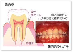 歯肉炎は歯周病の始まり。プラーク(歯垢)の中の細菌によって、ハグキが炎症を起こして赤く腫れます。歯肉溝が3~5mmと深くなり、仮性ポケットといわれる状態になります。