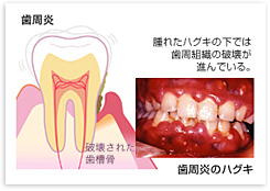 歯肉炎を放っておくと歯周炎に進行してしまいます。炎症がハグキだけではなくその下にある組織(歯根膜や歯槽骨)に及び、歯周組織の破壊が進みます。