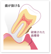 さらに進行すると歯槽骨が破壊されて歯を支えることができなくなり、歯が抜けてしまいます。