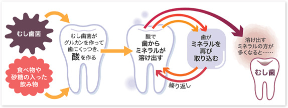 むし歯菌は、グルカンというネバネバの物質を作って歯に付着します。 そして、酸を作って歯のミネラルを溶かしてしまいます。