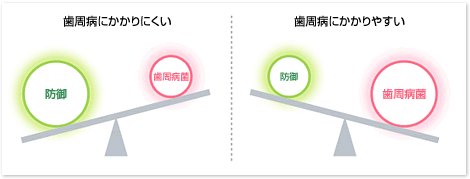 生体防御機能が同じようにはたらいていても、お口の中の清掃が行き届いている人に比べて、お口の中が不衛生で歯周病菌が多い人のほうが、歯周病を発症しやすくなります。一方、十分に歯みがきをしていてお口の中の歯周病菌が少ない人でも、身体の生体防御機能が低下していれば、歯周病を発症しやすくなってしまいます。