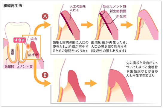 歯石やプラークなどを取り除くことで炎症のコントロールはできますが、歯周病で組織が破壊されてできた“すきま”(下図)に歯周組織を再生させることは容易ではありません。 歯周組織は、歯ぐき、歯槽骨歯根膜、そしてセメント質から成り立っています。歯槽骨歯根膜は再生するのにとても時間がかかります。イラストBのように先に歯ぐきと歯根がくっついてしまうと、歯槽骨歯根膜などがきちんと再生できません。