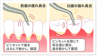 歯周病が進行して歯周組織が破壊されると歯をしっかりと支えられなくなるので、歯がグラグラしてきます。この揺れ具合を、ピンセットを使って歯を動かして確認します。