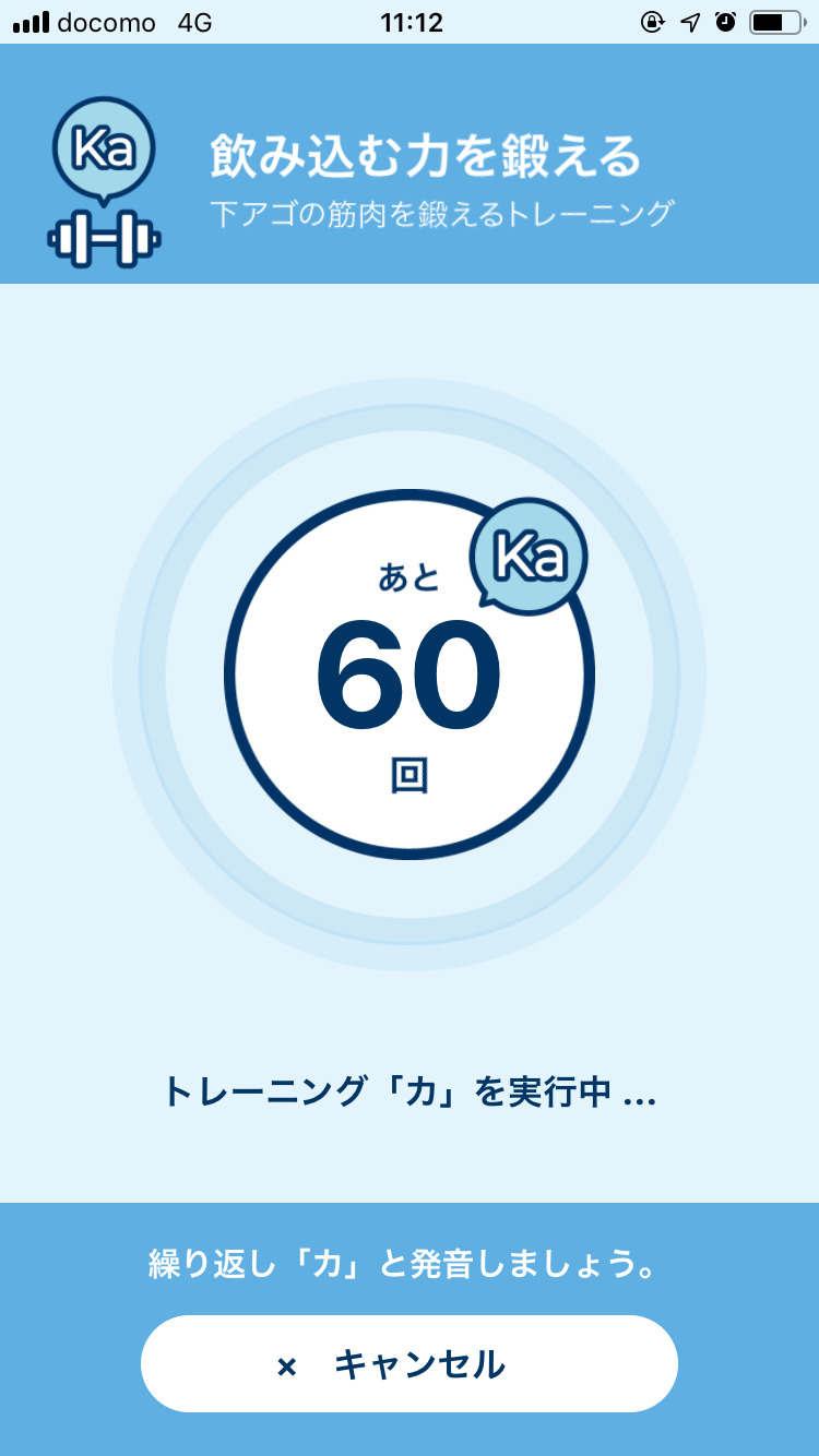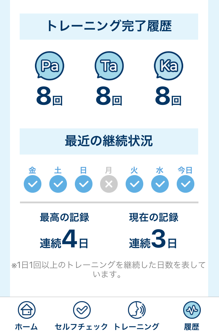 スマートフォンのマイクに向かって「パ」「タ」「カ」をそれぞれ5秒間に何回発音できるか計測。「パ」の音で食べ物を口からこぼさない唇の働き、「タ」の音で上あごにしっかりくっつく舌の働き(食べ物を押しつぶす、飲み込む)、「カ」の音で誤嚥せずに食べ物を食道に送る筋肉の働きをチェックします。