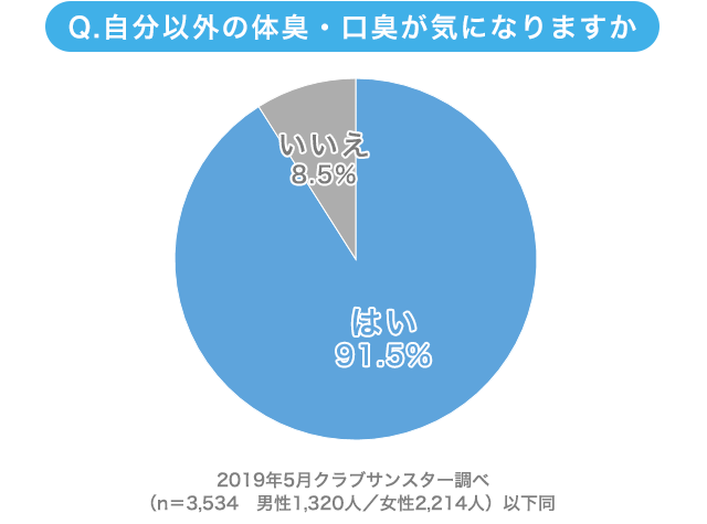 まず、自分以外の体臭や口臭が気になるかをたずねてみると、なんと回答者の91.5%が「気になる」という結果に。他人のにおいが気になるという経験はほとんどの人がしているようです。
