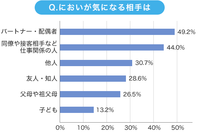次ににおいが気になる相手を聞くと、「パートナー・配偶者」が49.2%で一番という結果になりました。