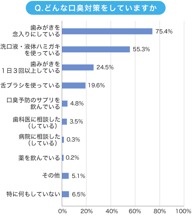 「歯みがきを念入りにしている」75.4%、「洗口液・液体ハミガキを使っている」55.3%と、半数以上は何らかの対策をしているようです。でも中には「特に何もしていない」という無意識な“スメハラ”予備軍も!