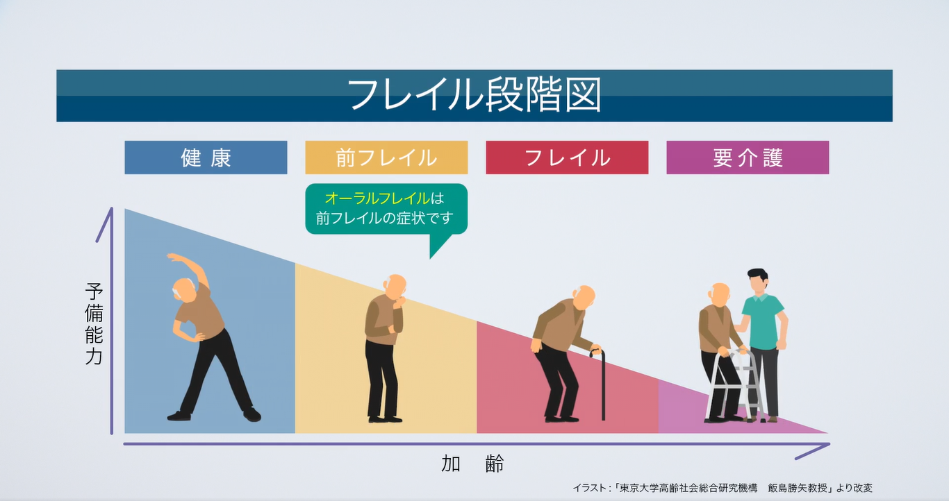 「オーラルフレイル」とは、オーラル(=口腔)とフレイル(=虚弱)を合わせた言葉で、食べこぼしや食事中の「むせ」といったささいなお口の衰えをきっかけにお口の機能が低下し、食べる機能の障害へと進んでいくこと。オーラルフレイルにより栄養状態が悪化すると、体力や筋力の低下を招き、全身のフレイル・衰えにつながります。