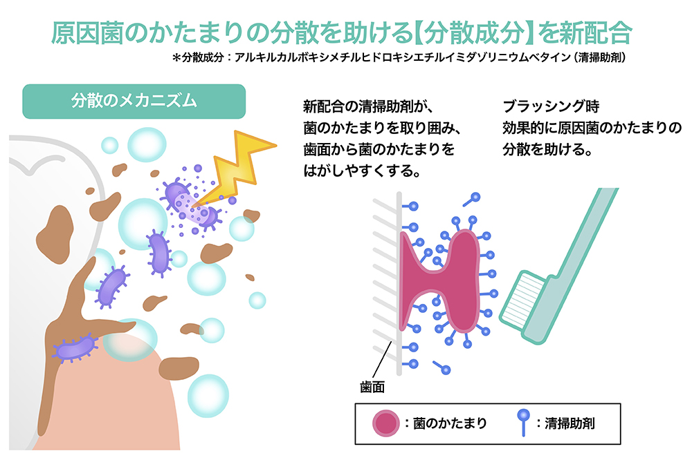 新配合した分散成分が歯にこびりついた菌の塊を取り囲んで剥がしやすくすることで、ブラッシングをした際に効果的に塊を分散することができます。分散することによって塊から出てきた細菌にも殺菌剤が届くようになりました。