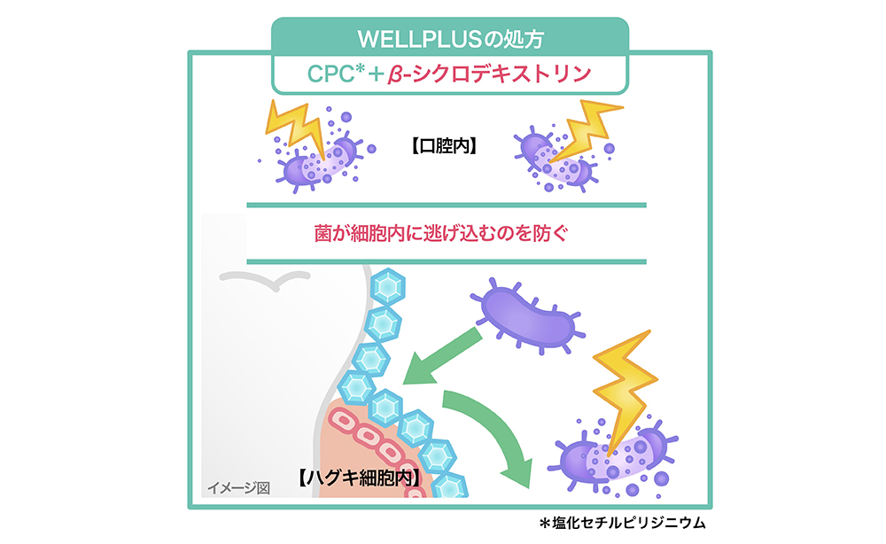 そこで、サンスターが開発したのが「WELLPLUS(ウェルプラス)」シリーズ。これまで知られていなかった歯周病菌の潜伏先にまで着目した「分散+ブロック処方」で、新しいオーラルケアが可能になりました。