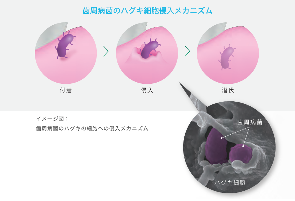 つまり、唾液や殺菌剤の届かないハグキ細胞に潜む歯周病菌は、通常のケアでは除去できず、歯周病のリスクになる可能性があるのです。