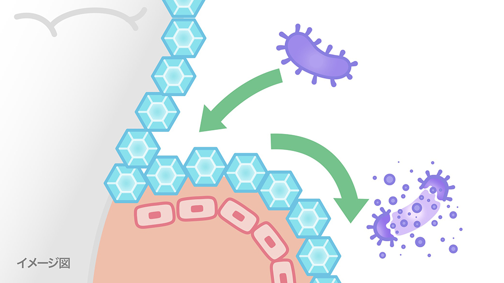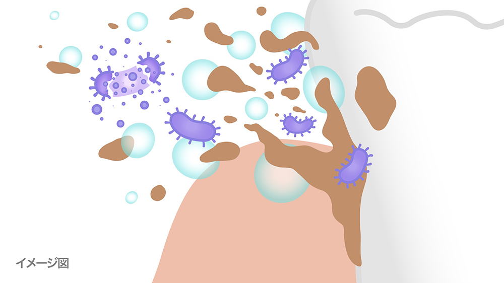 新たな分散成分を配合したことにより原因菌のかたまりの分散を助け、かたまりの奥にいる細菌にも殺菌剤が届くようにします。