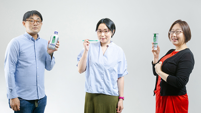 (3人とも、ガム・ウェルプラスシリーズのデンタルペースト、デンタルリンス、デンタルブラシを使って歯みがき)